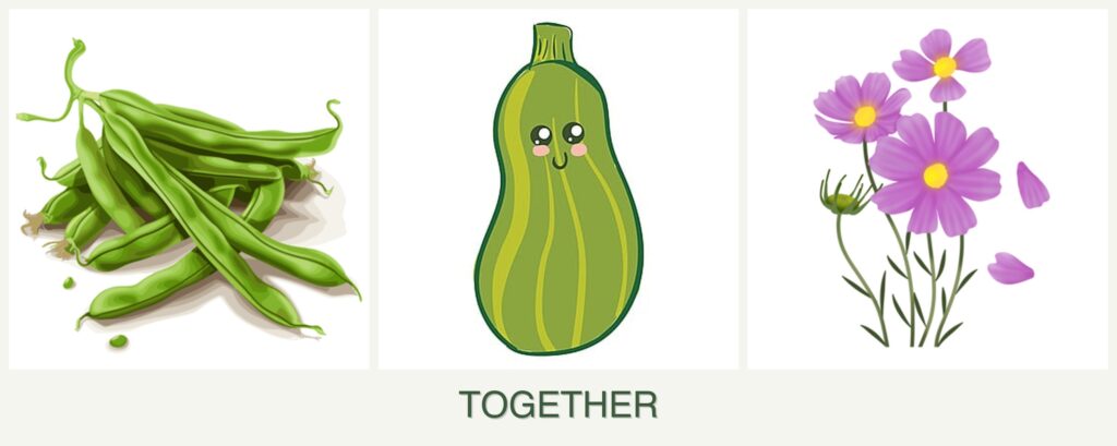 Planting beans, zucchini, and cosmos together offers several advantages: