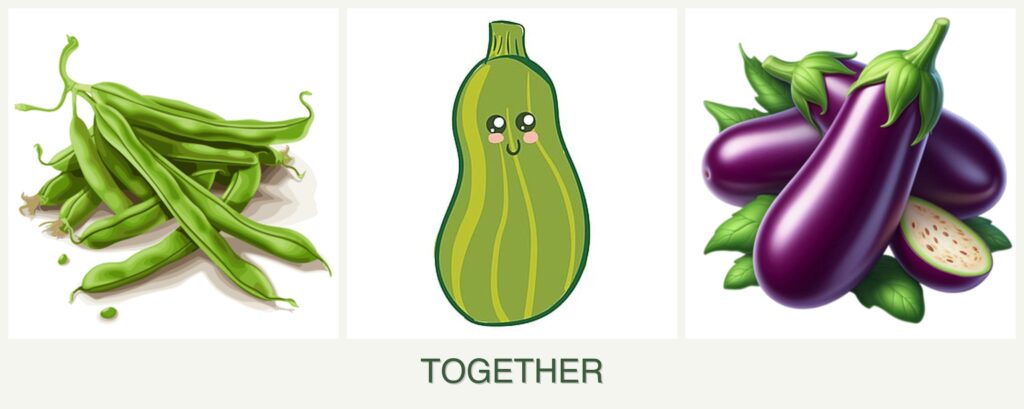 Growth Requirements: Beans are nitrogen-fixing plants, enriching the soil for zucchini and eggplant, which are heavy feeders. Zucchini and eggplant both enjoy full sun and well-drained soil, making them compatible in terms of sunlight and soil conditions.