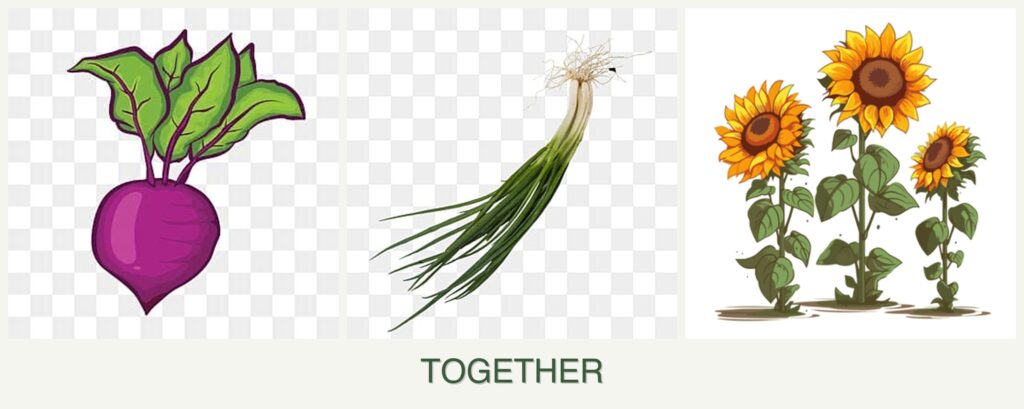 Chives are known for their pest-repellent properties, particularly against aphids, which can benefit beets and sunflowers. Sunflowers attract pollinators, enhancing the overall health of the garden.