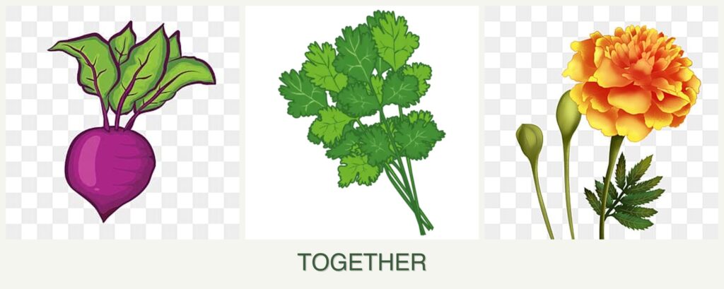- Growth Requirements: Beets and cilantro share similar sunlight and soil needs, while marigolds can adapt to a range of conditions.