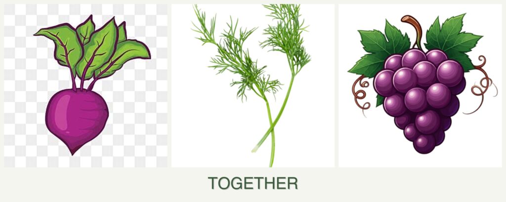 - Growth Requirements: Beets and dill share similar sunlight and soil needs, making them good companions. Grapes, however, are perennials that need more space and support, which may require strategic placement.