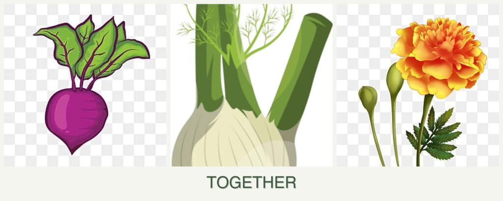 - Timing: Plant beets and marigolds in early spring, while fennel should be started later to avoid frost.