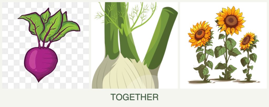 - Timing: Sow beets and sunflowers in early spring. Fennel can be planted later to avoid competition.