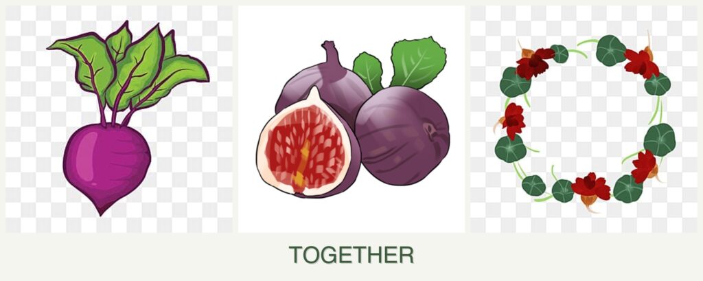 - Growth Requirements: Beets and nasturtiums thrive in similar soil conditions, while figs, being a tree, have different needs but can coexist if given enough space.