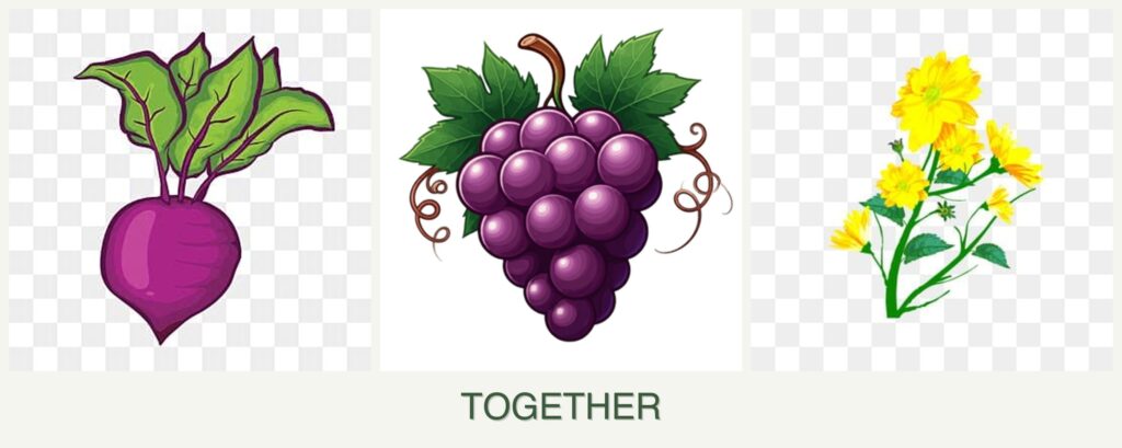 Nutrient Needs: Beets and calendula have moderate nutrient needs, while grapes require more nutrients, particularly phosphorus and potassium. Companion planting can help balance soil nutrient levels.