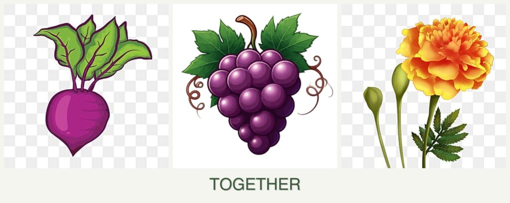 - Timing: Plant beets in early spring or fall, grapes in spring, and marigolds after the last frost.