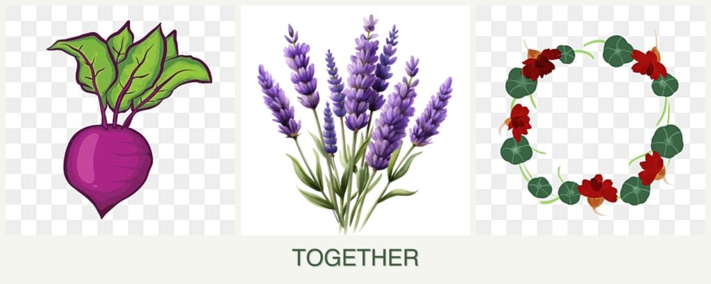 - Timing: Plant beets in early spring or fall, lavender in late spring, and nasturtiums after the last frost.