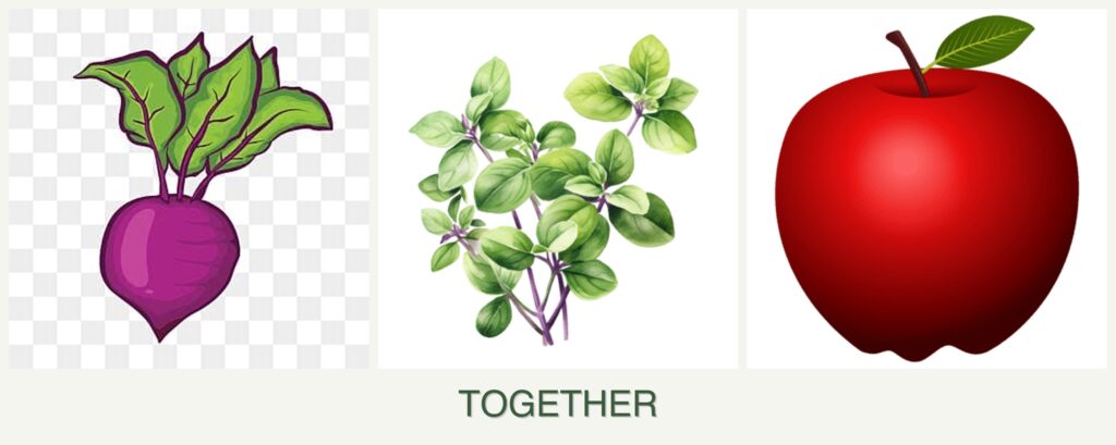 - Growth Requirements: Beets thrive in cool weather, oregano prefers a warm climate, and apple trees need a full sun environment. Despite these differences, they can be strategically planted to accommodate each other’s needs.