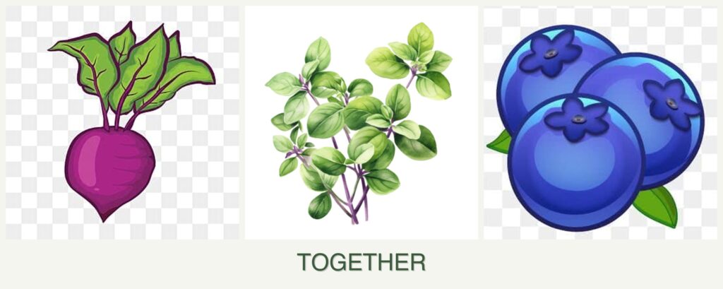 - While not ideal together, plant each according to its seasonal preference: beets and blueberries in early spring, oregano in spring.