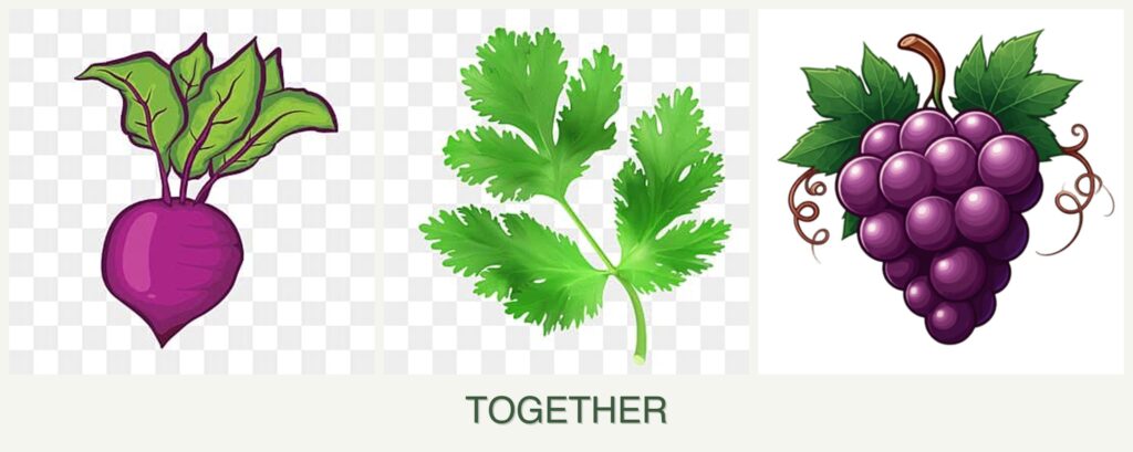 - Growth Requirements: Beets and parsley thrive in similar conditions and do not overshadow each other, while grapes grow vertically and do not compete for ground space.