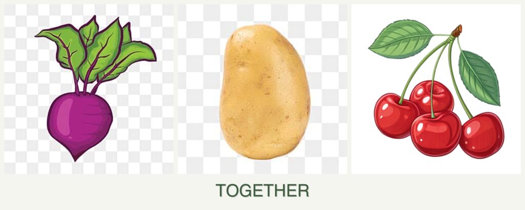 - Growth Requirements: Beets and potatoes are root vegetables with similar soil needs, but cherries are fruit trees that require different conditions.