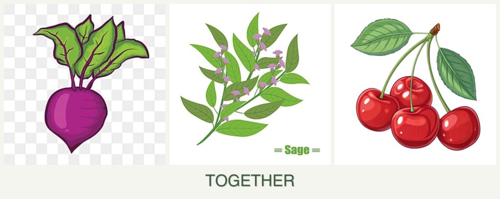- Growth Requirements: Beets prefer cooler temperatures and can tolerate partial shade, while sage thrives in full sun and warm conditions. Cherries, being fruit trees, require ample sunlight and space to grow.