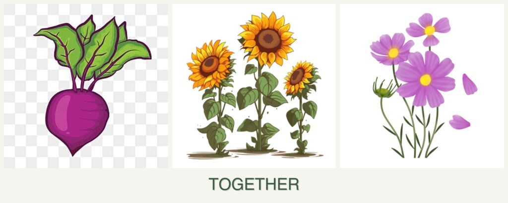 Nutrient Needs: Beets are root vegetables and draw nutrients from deeper soil layers, while sunflowers and cosmos take nutrients from the upper layers. This reduces competition for resources.