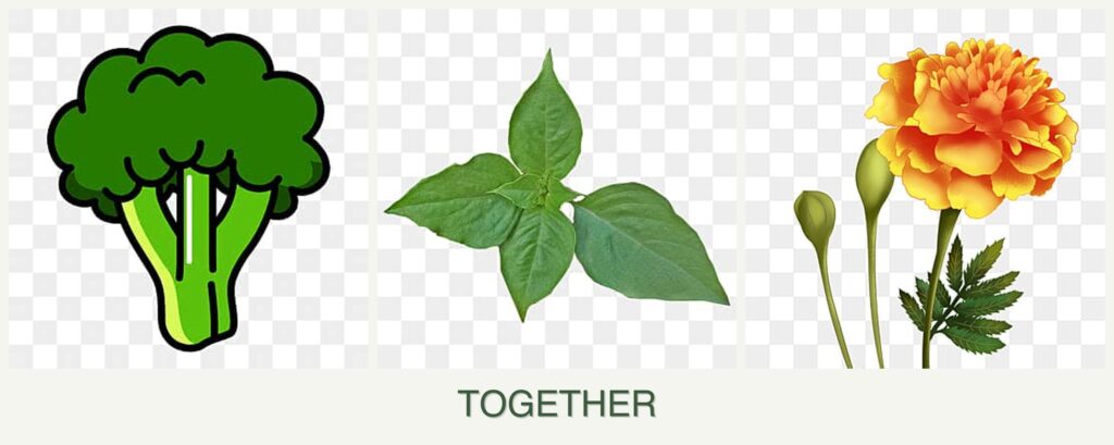 Planting broccoli, basil, and marigolds together offers several benefits: