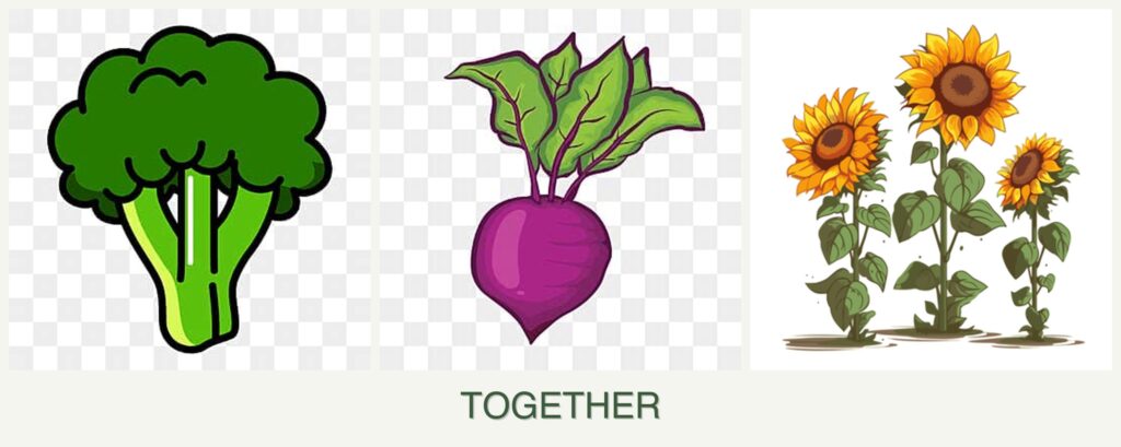- Growth Requirements: Broccoli and beets thrive in similar soil conditions, while sunflowers require more space due to their height.