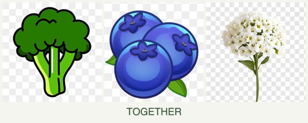 Can you plant broccoli, blueberries, and alyssum together? The short answer is no. While alyssum can be a beneficial companion to both broccoli and blueberries, broccoli and blueberries have conflicting requirements that make them unsuitable neighbors.