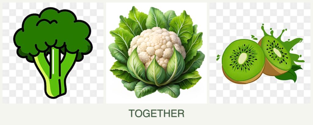 Broccoli and cauliflower belong to the Brassicaceae family and thrive in cool weather with similar nutrient and water needs. They are often planted together in vegetable gardens. Kiwi, on the other hand, is a fruiting vine that requires a warm climate, ample space, and a sturdy trellis for support. Its growth habit and environmental requirements differ significantly from those of broccoli and cauliflower, making it an unsuitable companion plant.