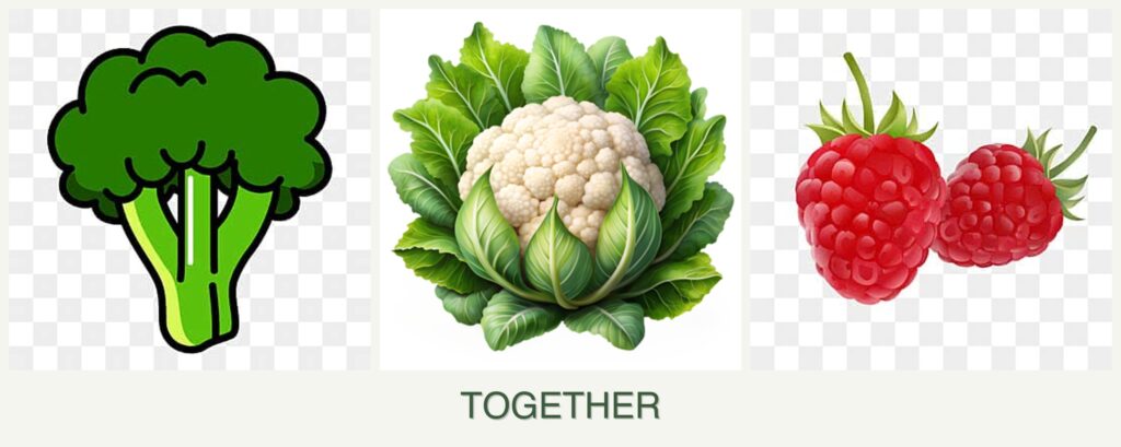 - Growth Requirements: Broccoli and cauliflower need similar conditions, but raspberries require different soil pH and spacing.