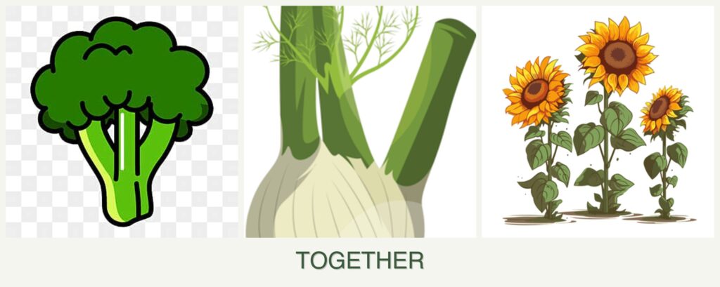 Growth Requirements: Broccoli prefers cooler temperatures, while sunflowers thrive in warm, sunny conditions. Fennel can adapt to a range of climates but tends to dominate its space.