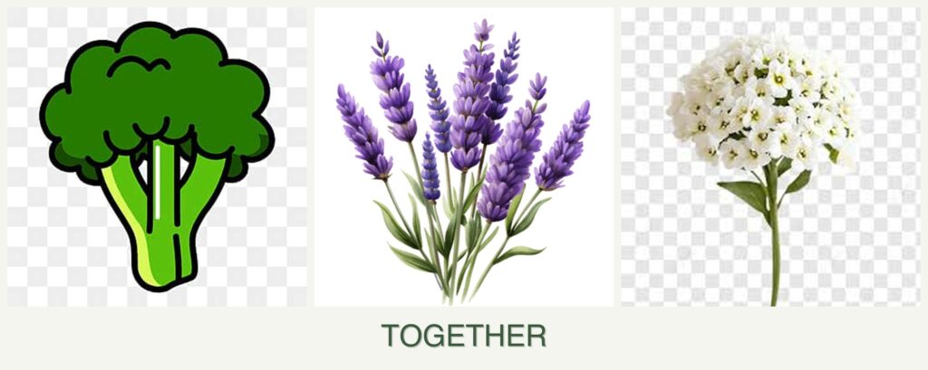 - Pest Control: Lavender’s scent deters pests that might otherwise target broccoli. Alyssum attracts beneficial insects like ladybugs and hoverflies, which help control aphids.