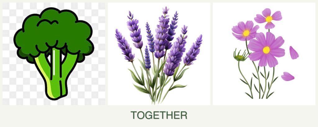- Competition for Resources: Broccoli’s high nutrient needs may compete with lavender and cosmos if not managed.