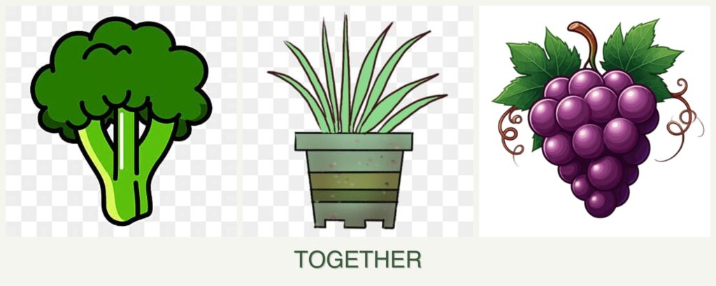 - Grapes need plenty of sunlight and well-drained soil but can overshadow broccoli, which requires ample space and light.