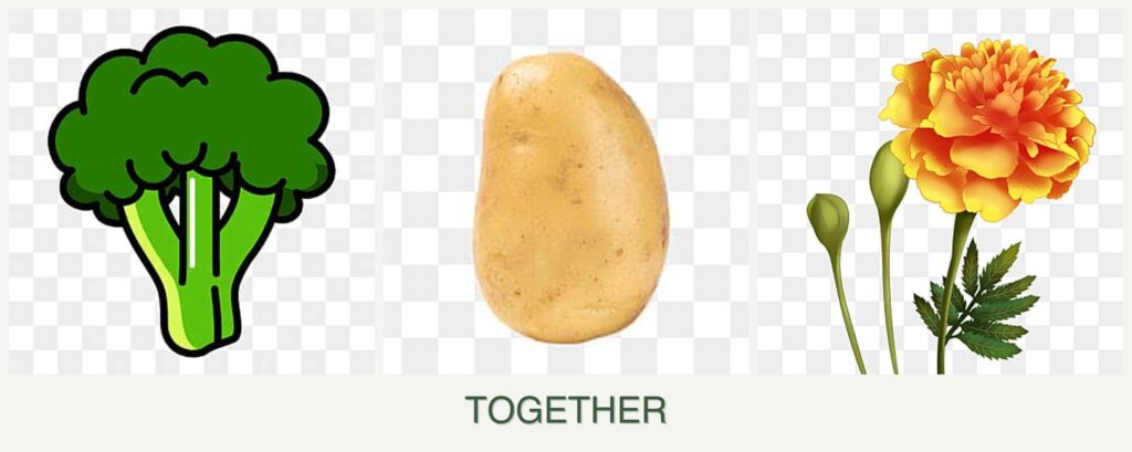 - Timing: Plant broccoli and marigolds in early spring, while potatoes can be planted slightly later.