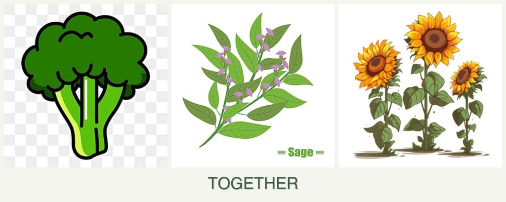 Planting broccoli, sage, and sunflowers together offers several benefits:
