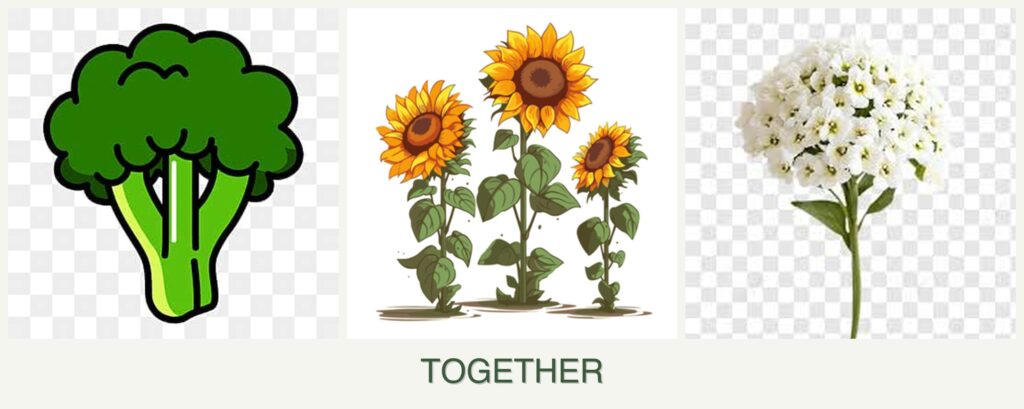 - Pest Control: Alyssum attracts beneficial insects that can help control pests affecting broccoli. Sunflowers can act as a trap crop for aphids, protecting nearby plants.