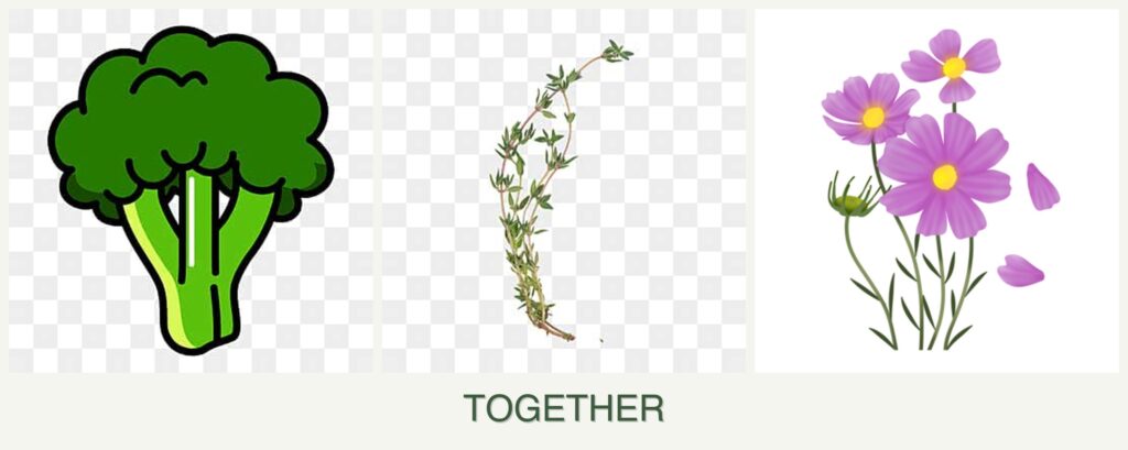 Planting broccoli, thyme, and cosmos together offers several advantages: