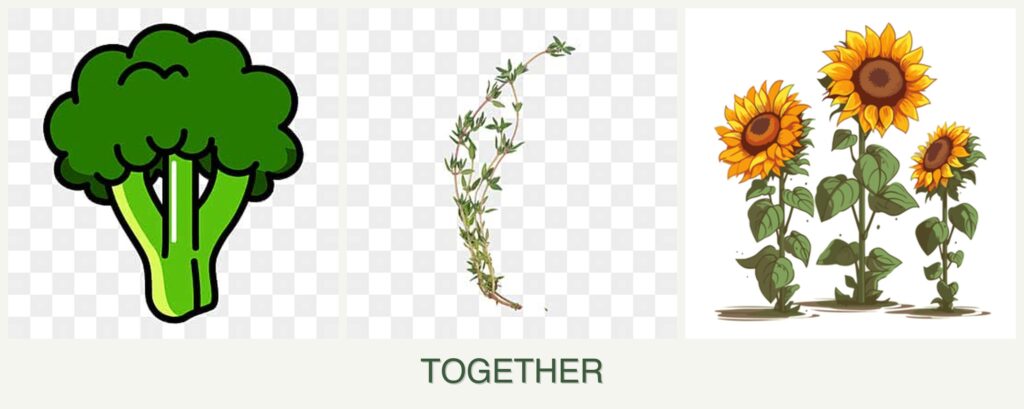 Planting broccoli, thyme, and sunflowers together can offer several benefits:
