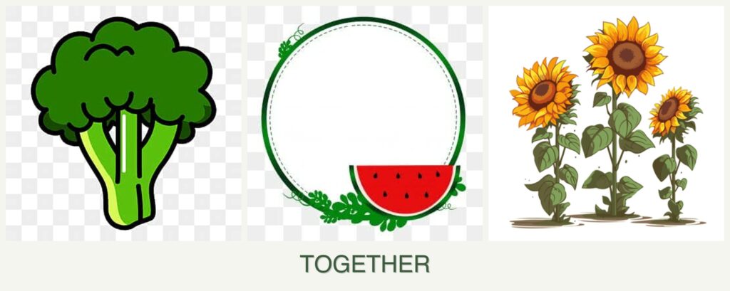 - Growth Requirements: Broccoli prefers cooler climates and partial shade, while watermelons and sunflowers need full sun and warm temperatures.