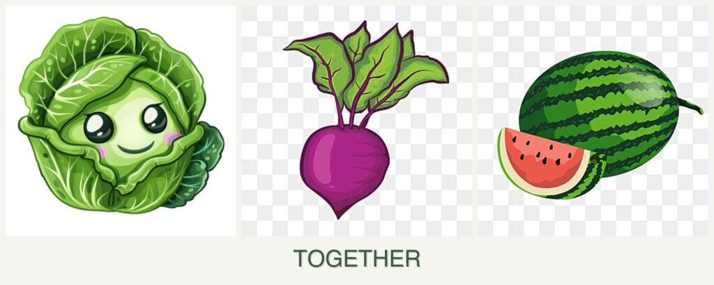 - Resource Competition: Cabbage and beets compete for nutrients, while melons require more space and water.
