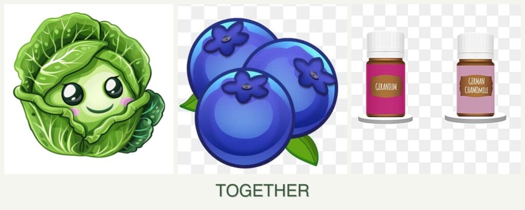 Cabbage and blueberries compete for nutrients and space, while geraniums can crowd both.