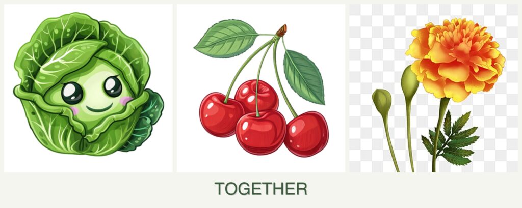 - Growth Requirements: Cabbage prefers cooler temperatures and full sun, while cherries thrive in full sun with well-drained soil. Marigolds are versatile and can grow in a range of conditions.