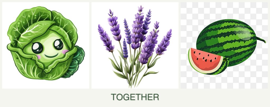 Resource Competition: Cabbage and melons compete for nutrients and water, while lavender’s different needs can disrupt balance.