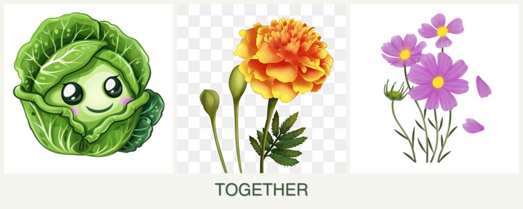 - Pest Control: Marigolds are known for their pest-repellent properties, particularly against nematodes, which can benefit cabbage. Cosmos attract beneficial insects that help control pests naturally.