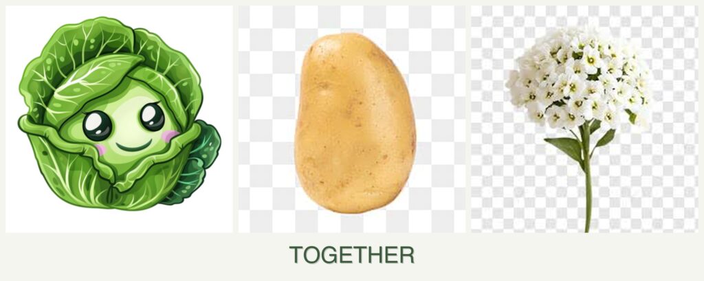 - When to Plant: Plant potatoes in early spring and cabbage in mid-spring. Alyssum can be sown alongside or after these to fill gaps.