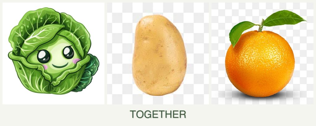 - Spacing: Cabbage and potatoes can be grown relatively close together, but oranges require much more space due to their size.