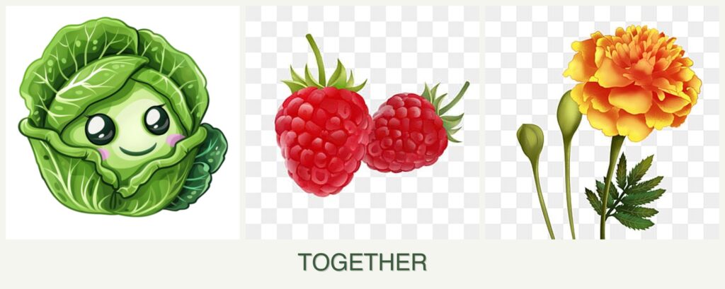 Pest Control: Marigolds deter pests like nematodes and aphids, benefiting cabbage. Raspberries don’t directly benefit from marigolds but aren’t negatively affected.