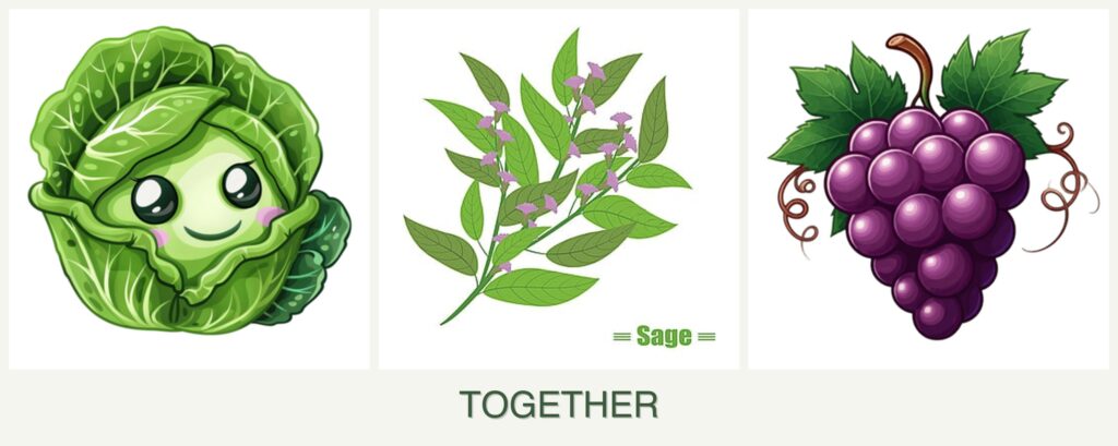 - Spacing: Grapes need ample space and support, potentially crowding out cabbage and sage.