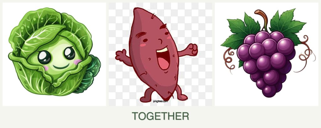 - Spacing: Grapes need vertical space, while sweet potatoes spread horizontally, potentially overshadowing cabbage.