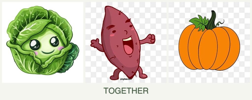 - Timing: Plant cabbage in early spring or fall, while sweet potatoes and pumpkins should be planted after the last frost when the soil is warm.
