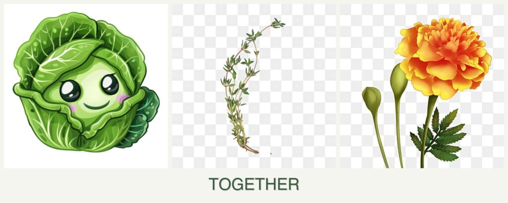 - Growth Requirements: Cabbage, thyme, and marigolds share similar sunlight and soil preferences, making them suitable companions.