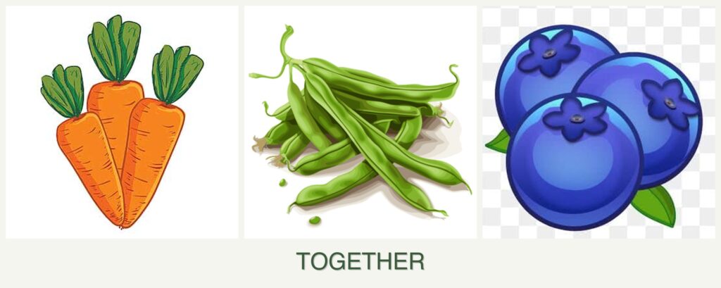 - Growth Requirements: Carrots and beans thrive in similar conditions, while blueberries need acidic soil and more moisture.