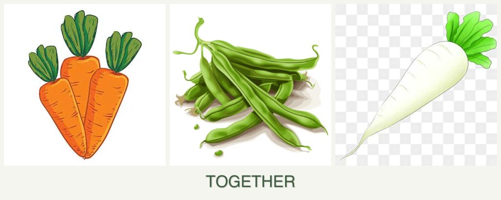 - Timing: Plant radishes first, as they mature quickly, followed by carrots and beans.