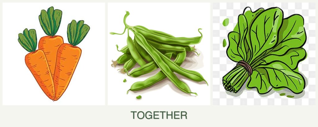 Pest Control: Beans can help deter pests that typically target carrots, such as carrot flies. Additionally, spinach acts as a ground cover, suppressing weeds that might compete with carrots and beans.