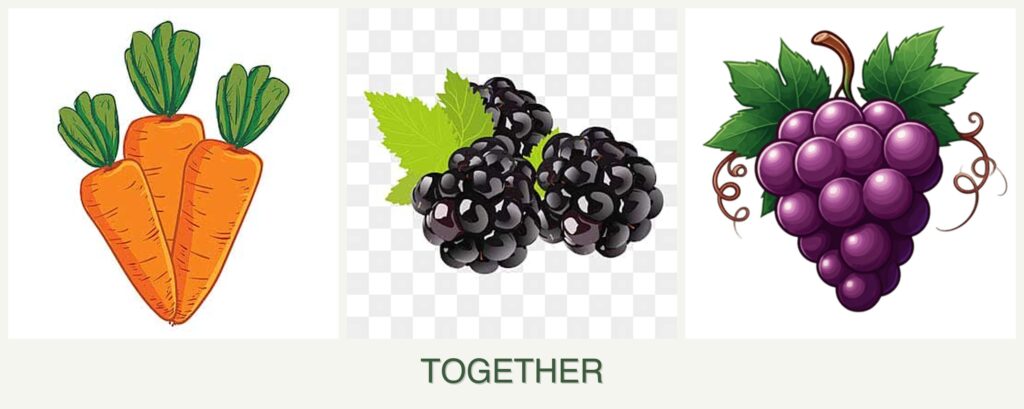 Nutrient Needs: Carrots are root vegetables that require different nutrients compared to the fruiting needs of blackberries and grapes. This difference can lead to competition for soil resources.
