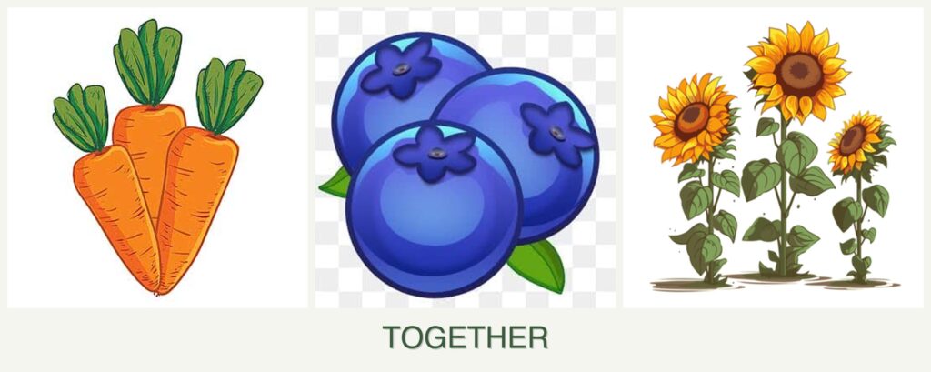 - Spacing: Sunflowers can grow quite tall and may overshadow or compete with the smaller carrot plants for sunlight, while blueberries require ample space for their root systems.