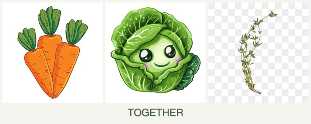 - Growth Requirements: Carrots and cabbage require similar soil types, while thyme adapts well to various conditions.